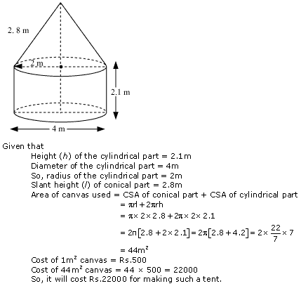A tent is in the shape of a cylinder surmounted by a conical top. If the height and diameter of the cylindrical part are 2.1 m and 4 m respectively, and the slant height of the top is 2.8 m, find the area of the canvas used for making the tent. Also, find the cost of the canvas of the tent at the rate of Rs 500 per m2. (Note that the base of the tent will not be covered with canvas.)