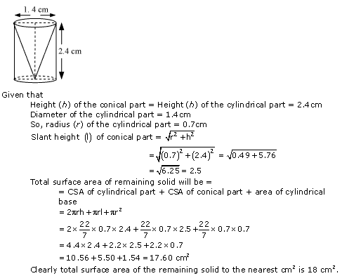 From a solid cylinder whose height is 2.4 cm and diameter 1.4 cm, a conical cavity of the same height and same diameter is hollowed out. Find the total surface area of the remaining solid to the nearest cm2.