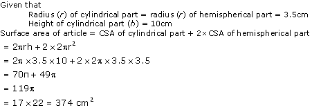 A wooden article was made by scooping out a hemisphere from each end of a solid cylinder, as shown in figure. If the height of the cylinder is 10 cm, and its base is of radius 3.5 cm, find the total surface area of the article.