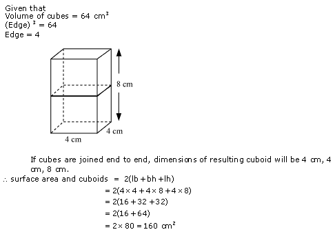 2 cubes each of volume 64 cm3 are joined end to end. Find the surface area of the resulting cuboid.