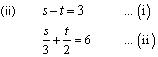 (ii) s – t = 3 ; s/3 + t/2 = 6