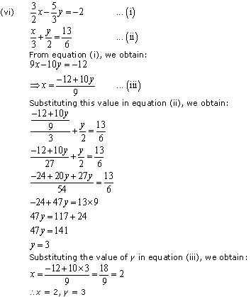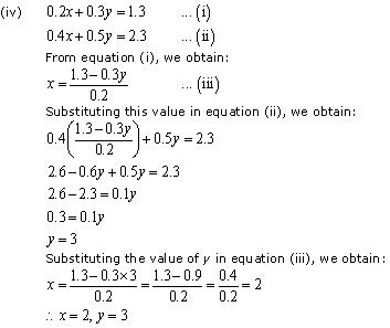 Concept Insight: In order to solve the given pairs of equations, we need to substitute the value of any one of the variable from any one of the equation. But make sure to substitute the value of that variable which simplifies calculations. For example, in part (iv) it is most convenient to substitute the value of x from the first equation to the second equation, as the division by 0.2 is more easier than the division by 0.3, 0.4 and 0.5.