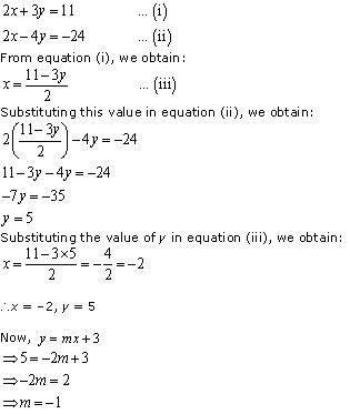 Question 2. Solve 2x + 3y = 11 and 2x – 4y = – 24 and hence find the value of ‘m‘ for which y =mx + 3.