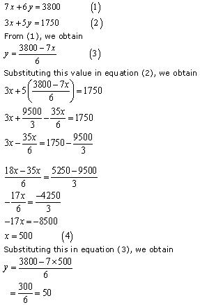 (iii) The coach of a cricket team buys 7 bats and 6 balls for Rs 3800. Later, she buys 3 bats and 5 balls for Rs 1750. Find the cost of each bat and each ball.