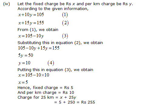 (iv) The taxi charges in a city consist of a fixed charge together with the charge for the distance covered. For a distance of 10 km, the charge paid is Rs 105 and for a journey of 15 km, the charge paid is Rs 155. What are the fixed charges and the charge per km? How much does a person have to pay for traveling a distance of 25 km?