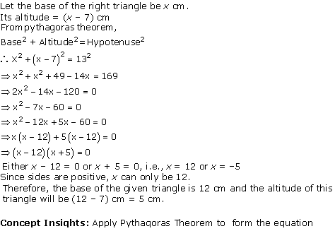 Question 5. The altitude of a right triangle is 7 cm less than its base. If the hypotenuse is 13 cm, find the other two sides.