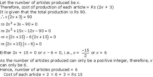 Question 6. A cottage industry produces a certain number of pottery articles in a day. It was observed on a particular day that the cost of production of each article (in rupees) was 3 more than twice the number of articles produced on that day. If the total cost of production on that day was Rs 90, find the number of articles produced and the cost of each article.