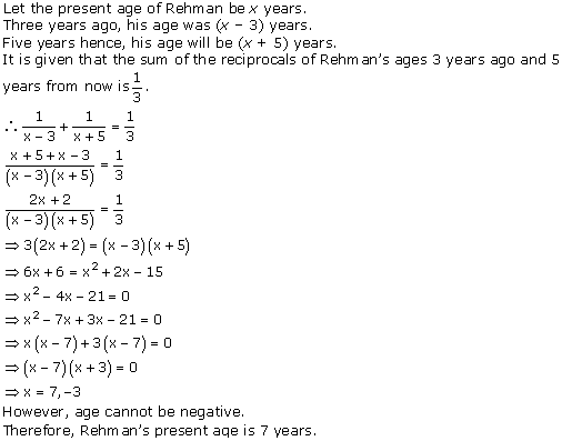 Question 4. The sum of the reciprocals of Rehman’s ages, (in years) 3 years ago and 5 years from now is 1/3. Find his present age.