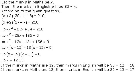 Question 5. In a class test, the sum of Shefali’s marks in Mathematics and English is 30. Had she got 2 marks more in Mathematics and 3 marks less in English, the product of their marks would have been 210. Find her marks in the two subjects.