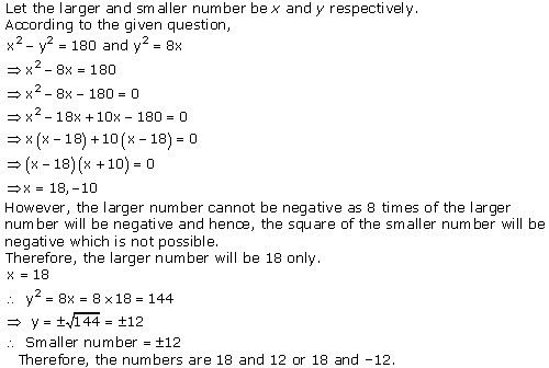 Question 7. The difference of squares of two numbers is 180. The square of the smaller number is 8 times the larger number. Find the two numbers.