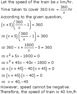 Question 8. A train travels 360 km at a uniform speed. If the speed had been 5 km/h more, it would have taken 1 hour less for the same journey. Find the speed of the train.