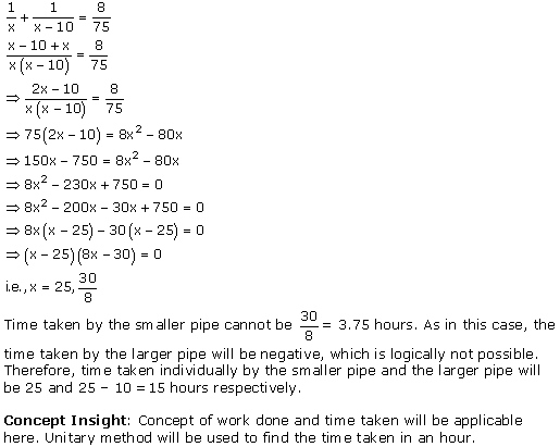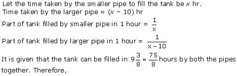 Question 9. Two water taps together can fill a tank in hours. The tap of larger diameter takes 10 hours less than the smaller one to fill the tank separately. Find the time in which each tap can separately fill the tank.