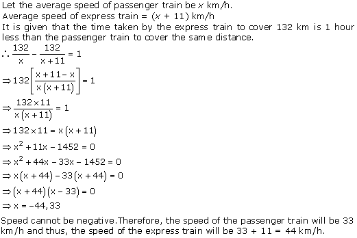 Question 10. An express train takes 1 hour less than a passenger train to travel 132 km between Mysore and Bangalore (without taking into consideration the time they stop at intermediate stations). If the average speeds of the express train is 11 km/h more than that of the passenger train, find the average speed of the two trains.