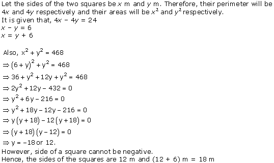 Question 11. Sum of the areas of two squares is 468 m2. If the difference of their perimeters is 24 m, find the sides of the two squares.