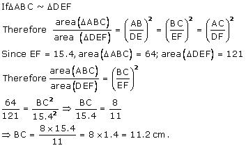 Question 1. Let ΔABC ~ ΔDEF and their areas be, respectively, 64 cm2 and 121 cm2. If EF = 15.4 cm, find BC.