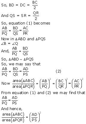 Question 6. Prove that the ratio of the areas of two similar triangles is equal to the square of the ratio of their corresponding medians.