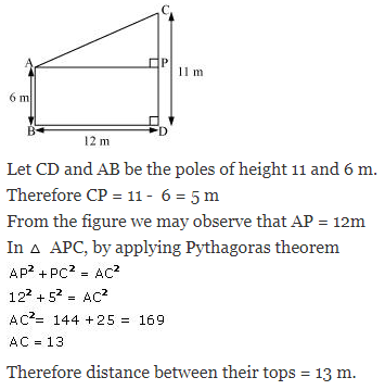 Question 12. Two poles of heights 6 m and 11 m stand on a plane ground. If the distance between the feet of the poles is 12 m, find the distance between their tops.