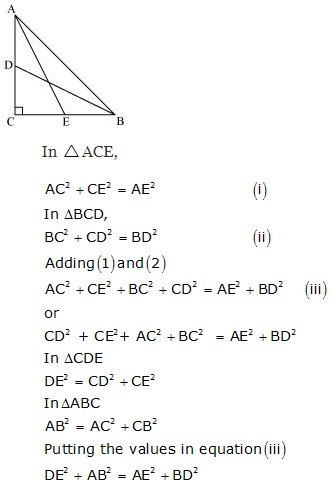Question 13. D and E are points on the sides CA and CB respectively of a triangle ABC right angled at C. Prove that AE2 + BD2 = AB2 + DE2.