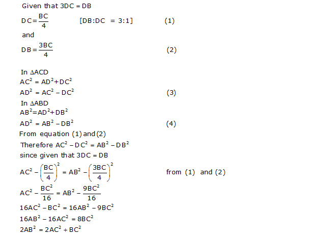 Question 14. The perpendicular from A on side BC of a Δ ABC intersects BC at D such that DB = 3CD (see Fig. 6.55). Prove that 2AB2 = 2AC2+ BC2.