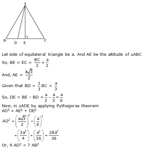 Question 15. In an equilateral triangle ABC, D is a point on side BC such that BD = 1/3BC. Prove that 9AD2 = 7AB2.