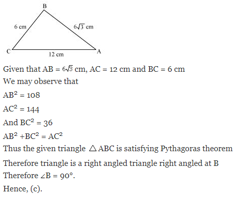 Question 17. Tick the correct answer and justify: In ΔABC, AB = 6√3 cm, AC = 12 cm and BC = 6 cm.
