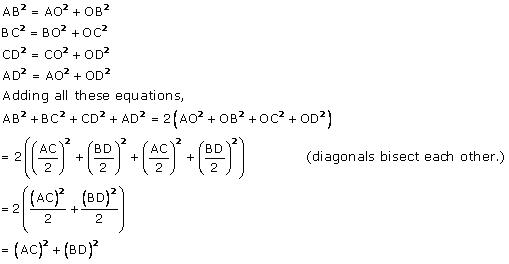 Question 7. Prove that the sum of the squares of the sides of rhombus is equal to the sum of the squares of its diagonals.