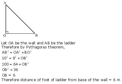 Question 9. A ladder 10 m long reaches a window 8 m above the ground. Find the distance of the foot of the ladder from base of the wall.