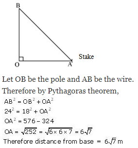 Question 10. A guy wire attached to a vertical pole of height 18 m is 24 m long and has a stake attached to the other end. How far from the base of the pole should the stake be driven so that the wire will be taut ?