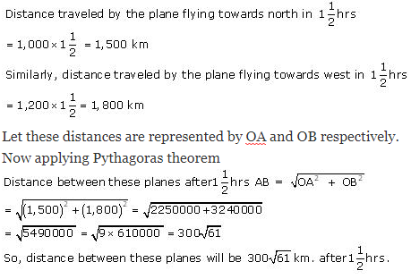 Question 11. An aeroplane leaves an airport and flies due north at a speed of 1,000 km per hour. At the same time, another aeroplane leaves the same airport and flies due west at a speed of 1,200 km per hour. How far apart will be the two planes after hours?