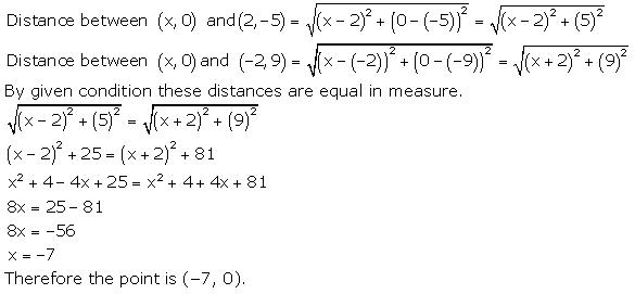 Question 7. Find the point on the x-axis which is equidistant from (2, – 5) and (- 2, 9).