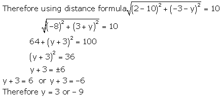 Question 8. Find the values of y for which the distance between the points P (2, – 3) and Q (10, y) is 10 units.