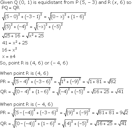 Question 9. If Q (0, 1) is equidistant from P (5, – 3) and R (x, 6), find the values of x. Also find the distance QR and PR.