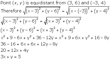 Question 10. Find a relation between x and y such that the point (x, y) is equidistant from the point (3, 6) and (- 3, 4).