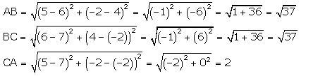 Question 4. Check whether (5, – 2), (6, 4) and (7, – 2) are the vertices of an isosceles triangle.