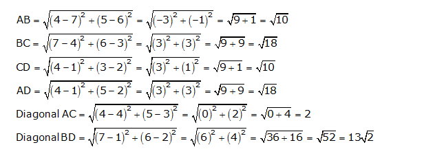 Here opposite sides of this quadrilateral are of same length but diagonals are of different length. So, given points are vertices of a parallelogram.