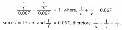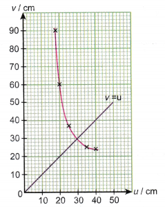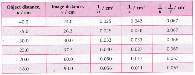 - The values of 1/u, 1/v and (1/u + 1/v) are calculated and corrected to two significant figures. The mean value for (1/u + 1/v) is determined.