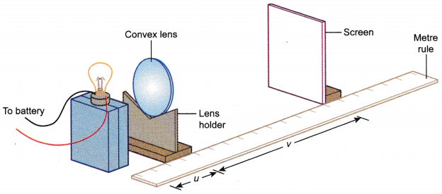 Apparatus: Light bulb, convex lens (f = 15 cm), metre rule, white screen, lens holder