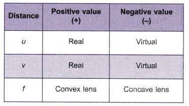 - Table shows the sign convention for the values of object distance, image distance and focal length. All distances are measured from the optical centre of the lens.