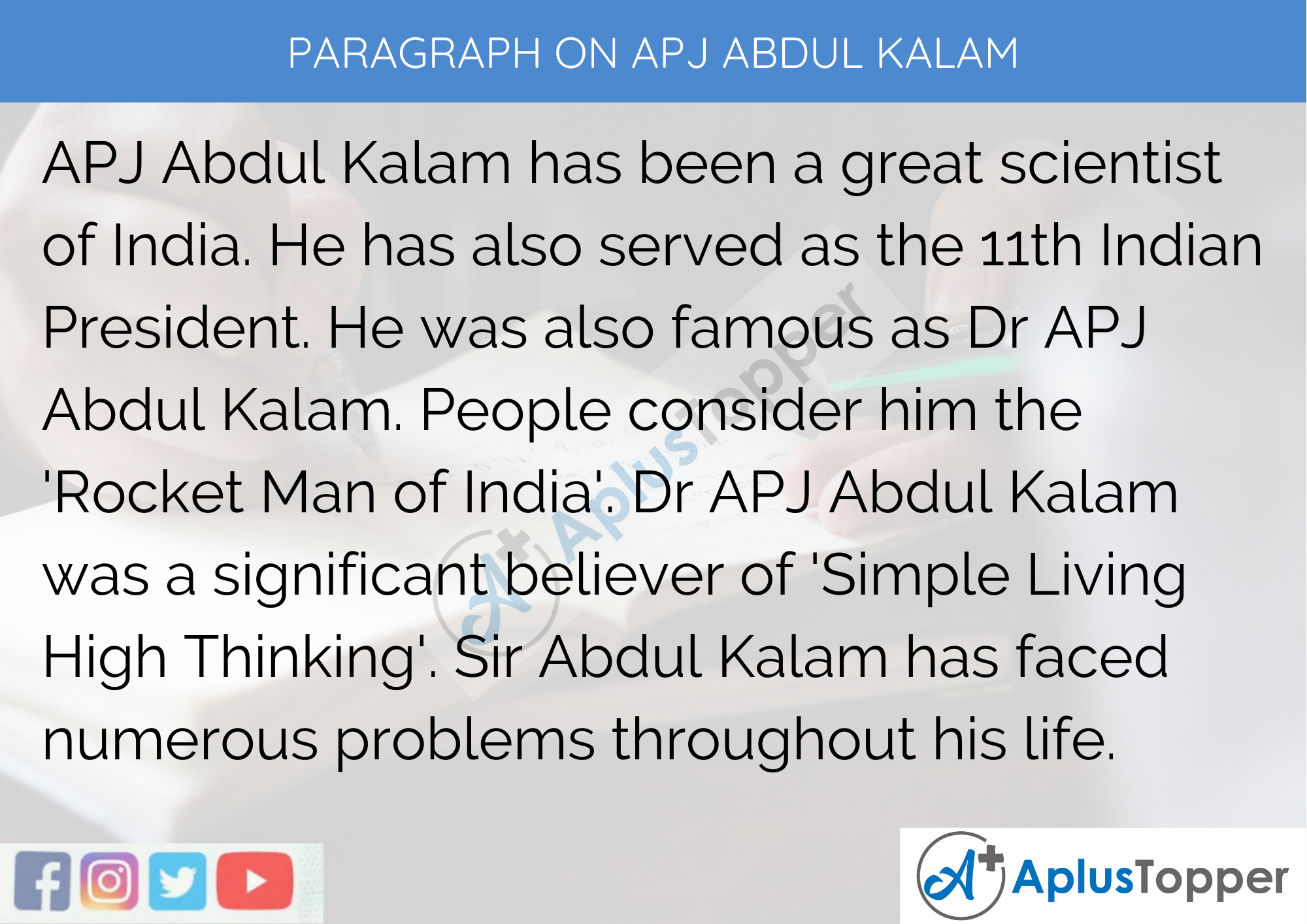 Paragraph On APJ Abdul Kalam: Dr. APJ Abdul Kalam is a motivation for the individuals of India. Individuals regarded him with great respect and used to call him Sir APJ Abdul Kalam. Indeed, even a child younger than ten knows who APJ Abdul Kalam is. He was an Indian aerospace researcher who filled in as the eleventh president of India.