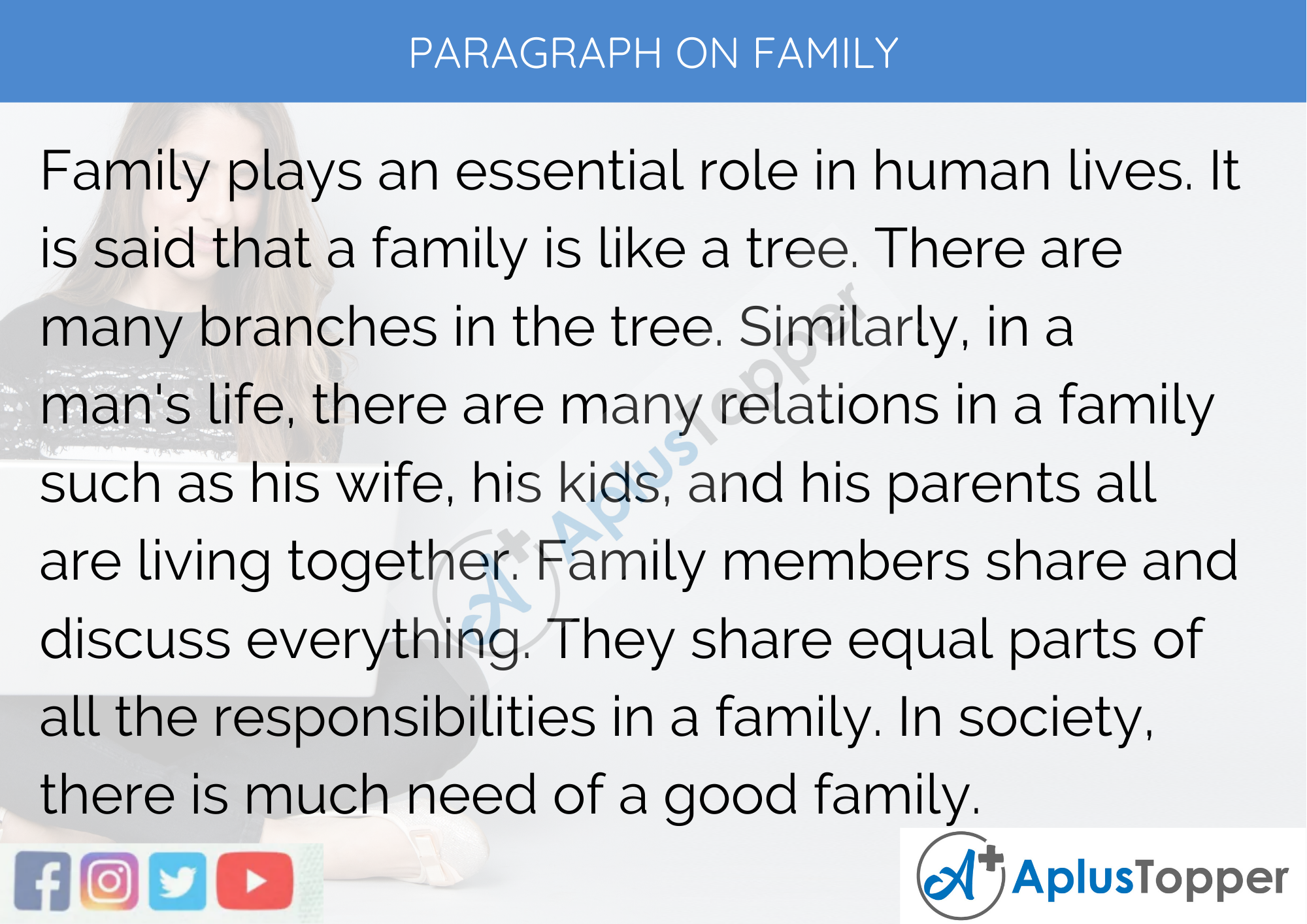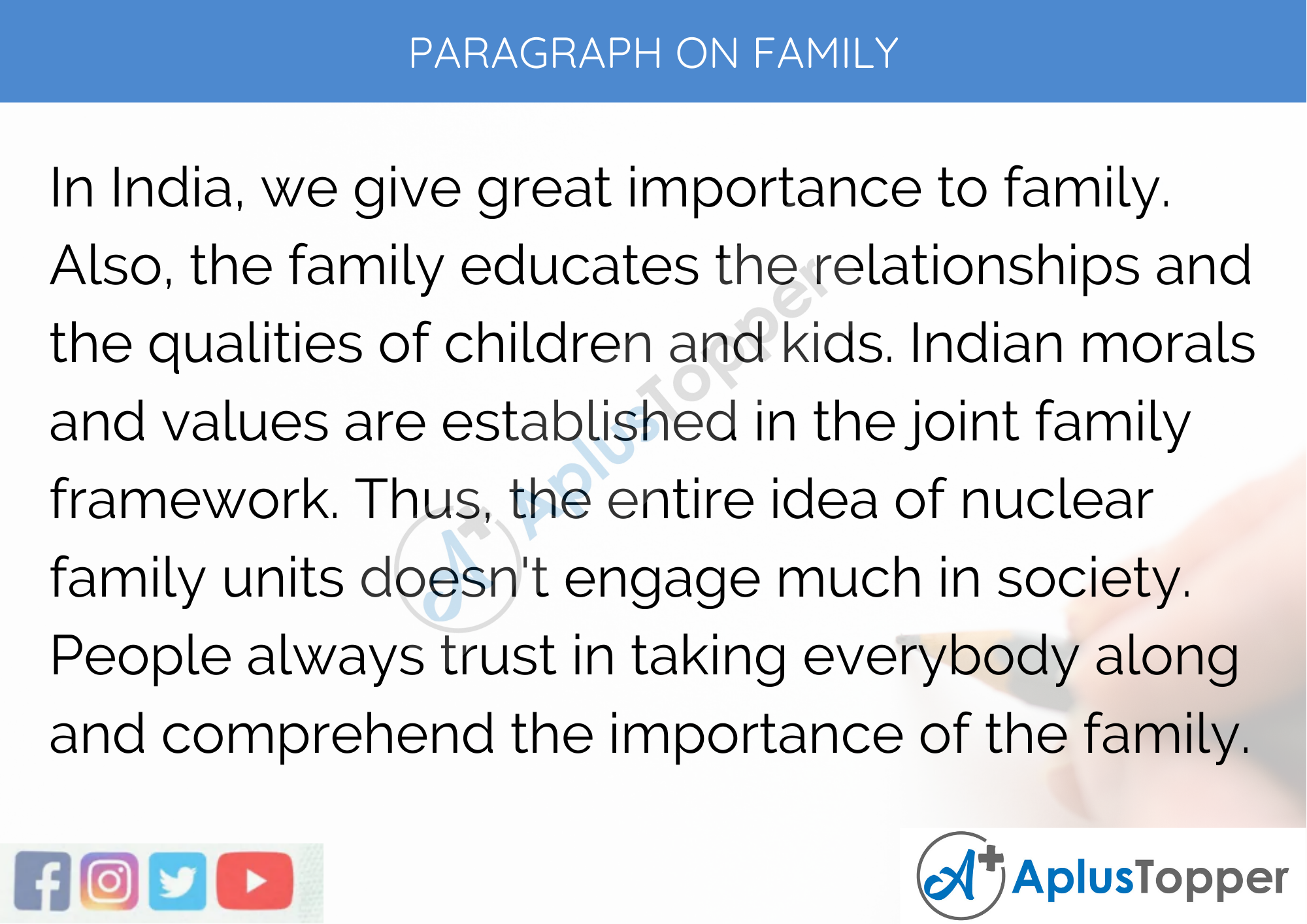 Paragraph On Family: Family is one of the most crucial parts of a human’s life. A person is incomplete without the complete family. It plays an essential role in society. Humans are social being and thus needs companionship from others. Family makes the kids and children get to learn some of the important values and morals of life.