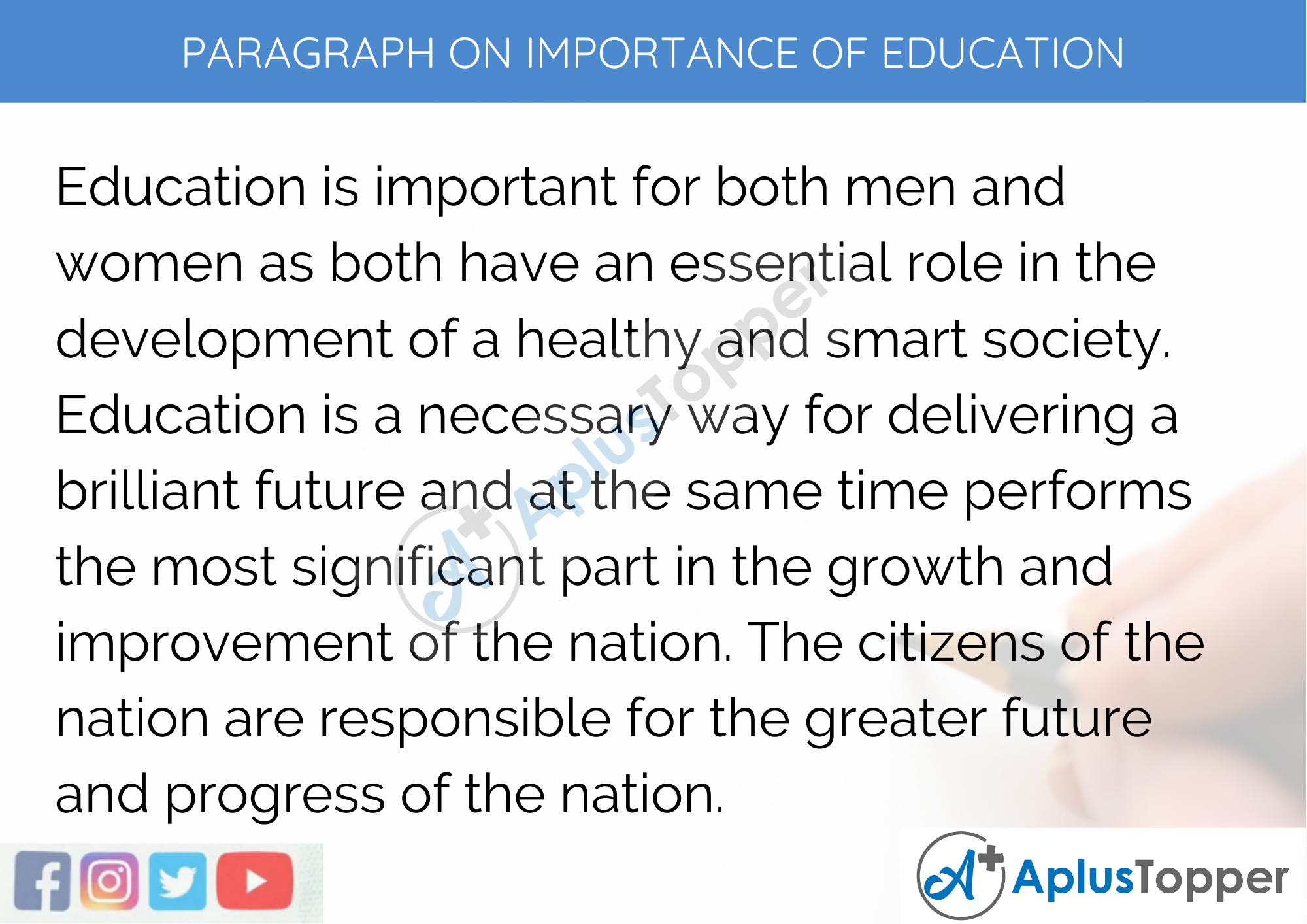 Education is important for both men and women as both have an essential role in the development of a healthy and smart society. Education is a necessary way for delivering a brilliant future and at the same time performs the most significant part in the growth and improvement of the nation. The citizens of the nation are responsible for the greater future and progress of the nation.