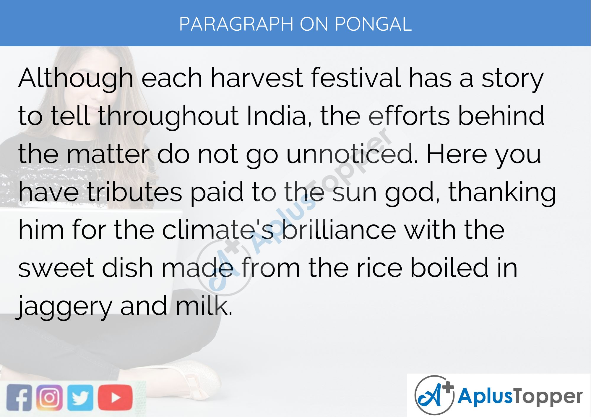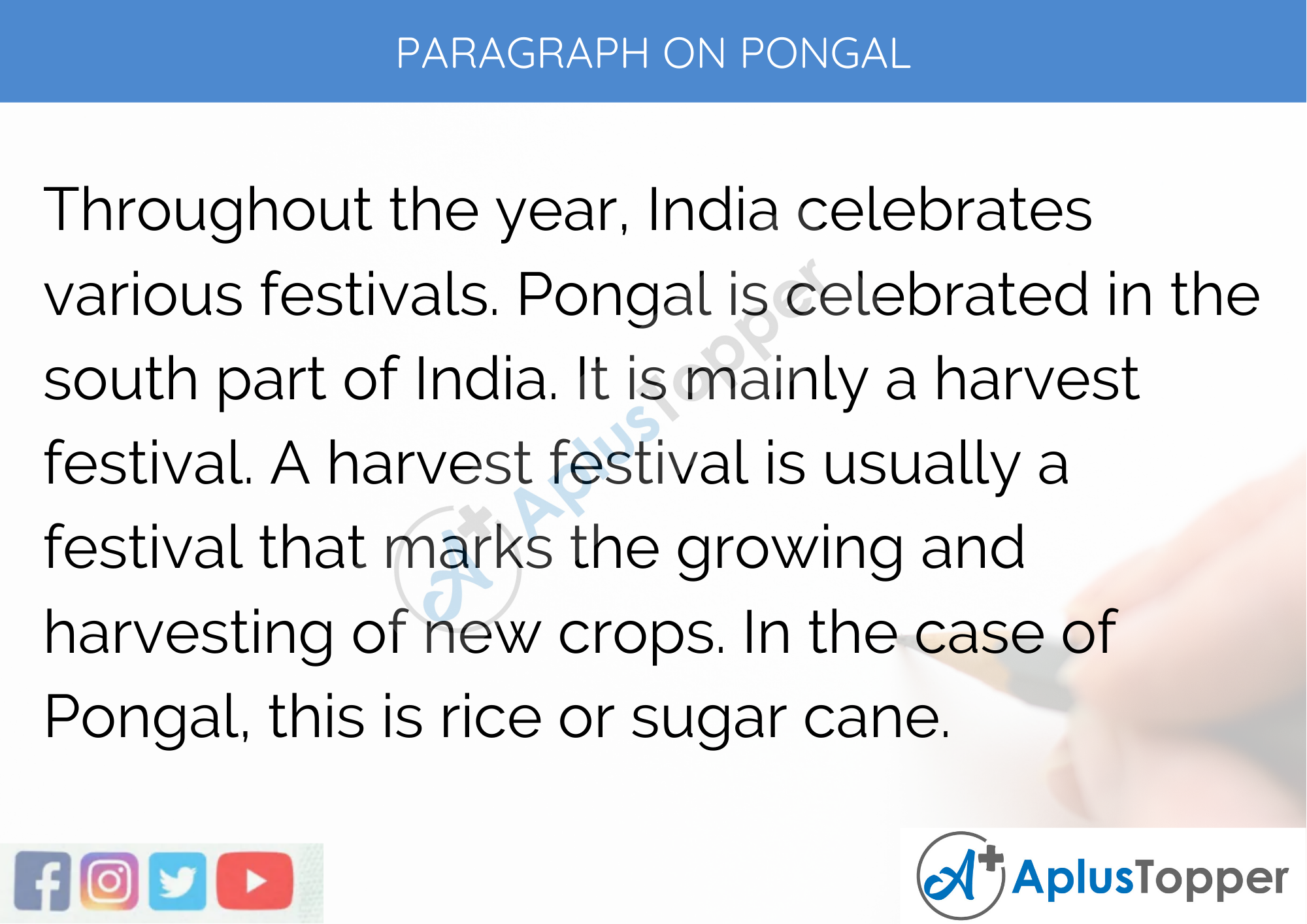 Paragraph On Pongal: Pongal is a four day Hindu festival celebrated in South India. The festival is celebrated to thank the Sun God for providing nourishment to the crops throughout the year. It is celebrated in the months of January-February. Most of the festivals in India are related to nature, and Pongal is one of them.