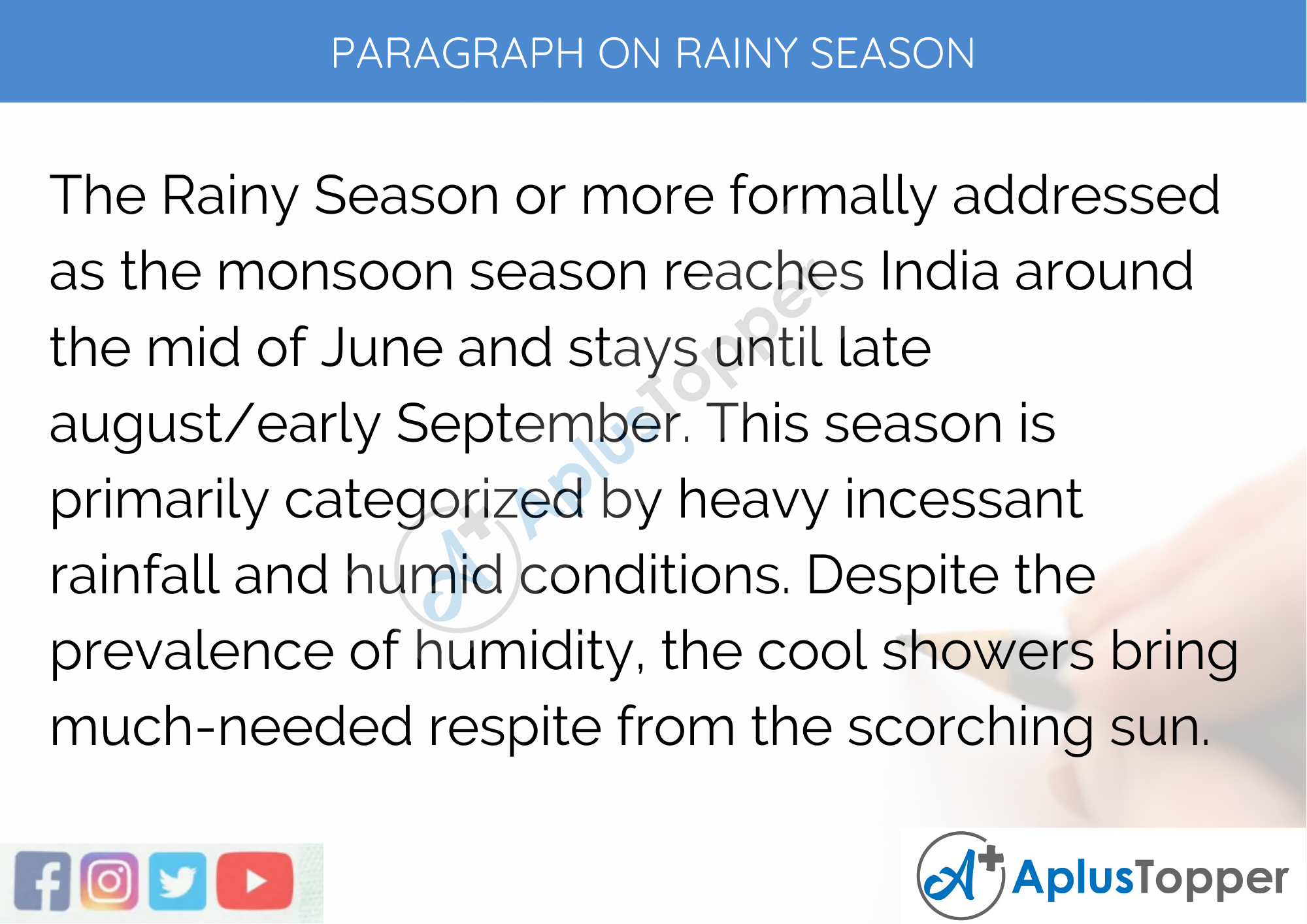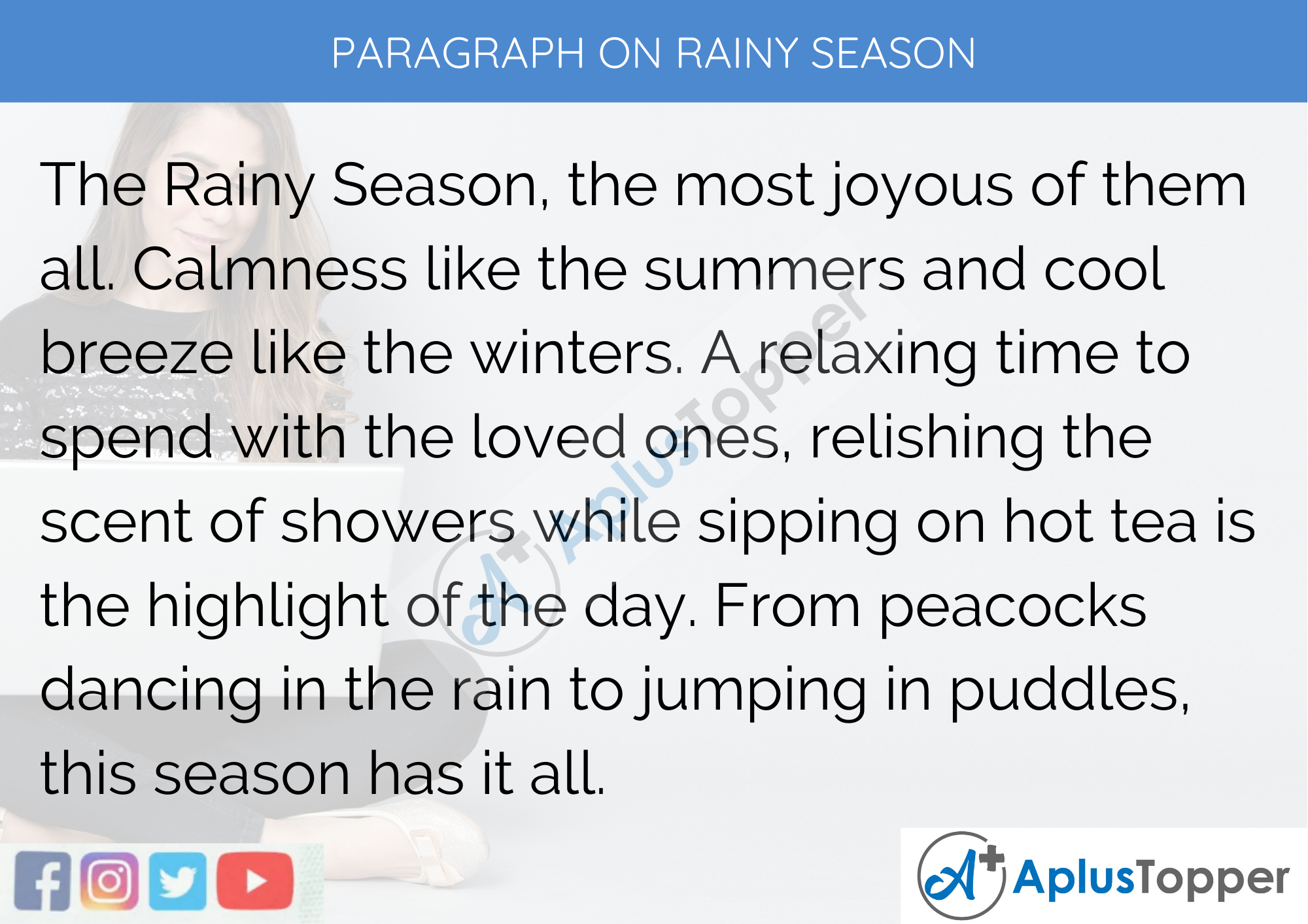 Paragraph on Rainy Season: Rainy Season or monsoon is the season categorized by heavy showers and pleasant weather. India, being an agrarian economy, heavily depends on the Rainy Season to provide enough irrigation for crops to grow. Rains bring a sense of calmness and tranquility with them and replenish Mother Nature in manifold ways.