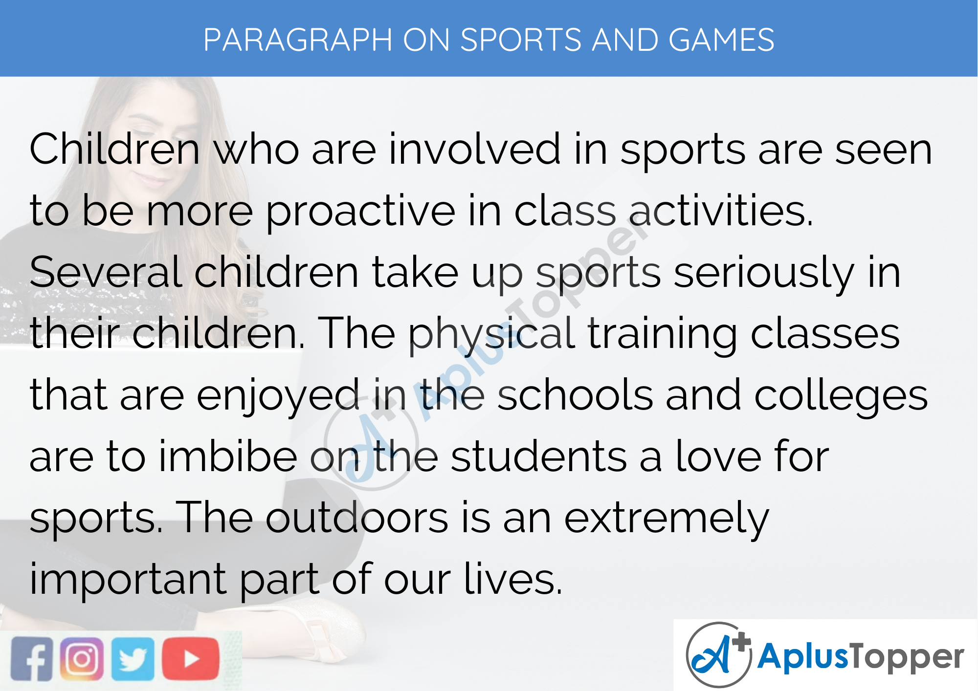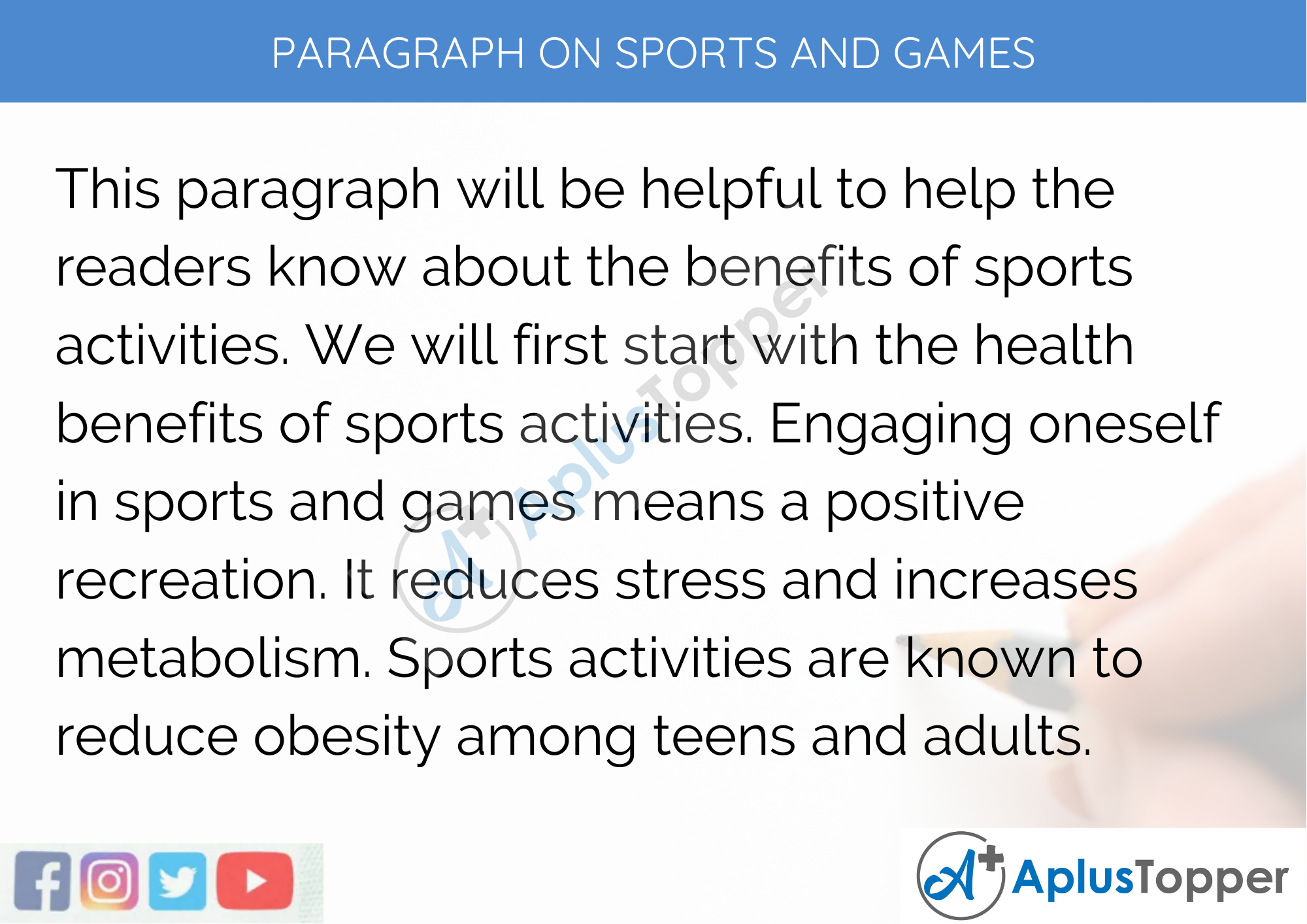 Games and Sports Paragraph: We will start with a small introduction to games and sports. Sporting activities require a lot of physical activity. It involves running and lifting. During sports, the body is continuously engaged. Games may require the individual to carry physical activities or can be done by staying indoors. Sports and games have a lot of health benefits.