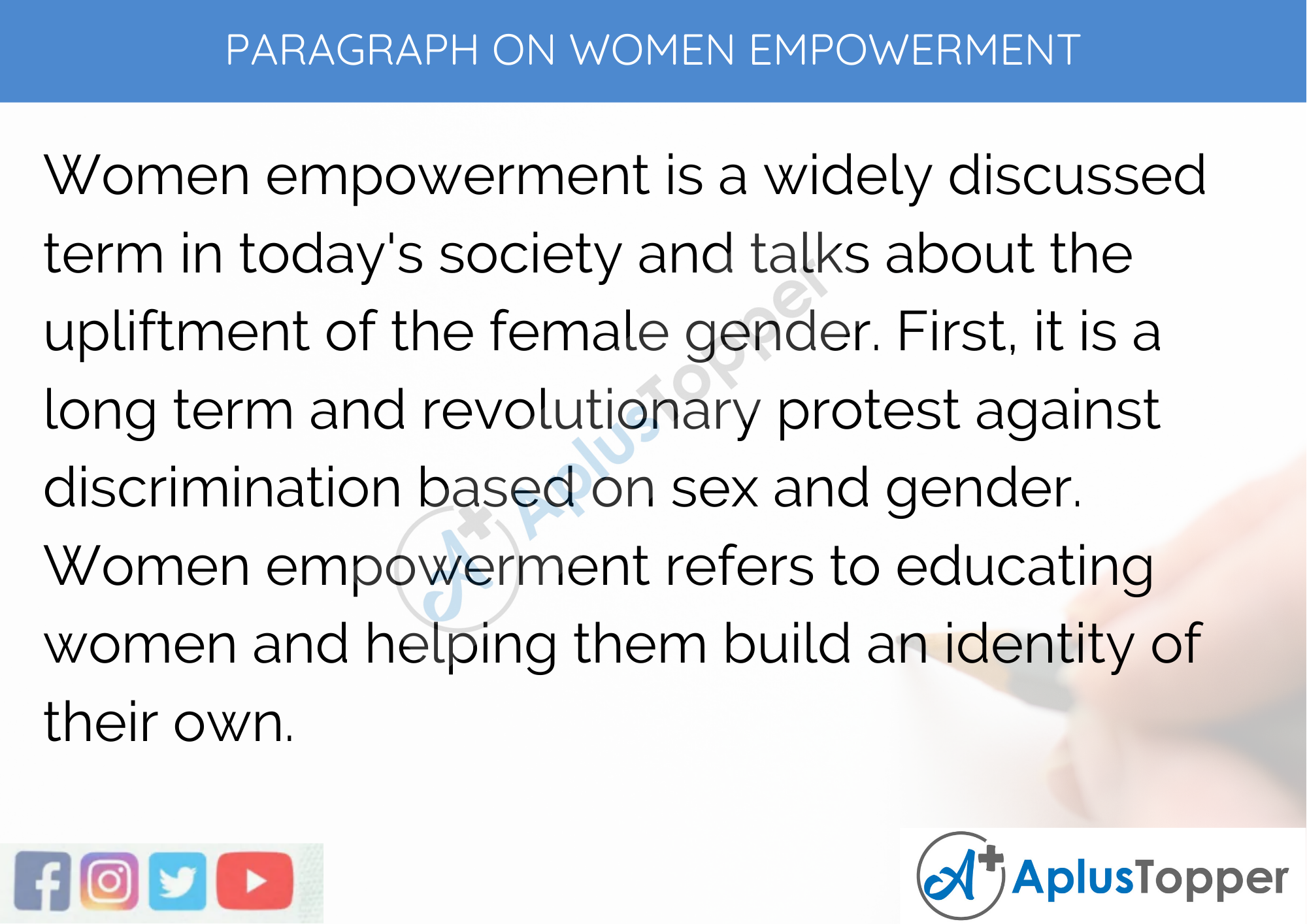 Women empowerment is a widely discussed term in today’s society and talks about the upliftment of the female gender. First, it is a long term and revolutionary protest against discrimination based on sex and gender. Women empowerment refers to educating women and helping them build an identity of their own.