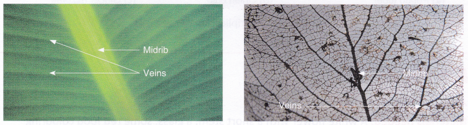 The arrangement of veins in a leaf is termed as venation. Venation is of two types: parallel and reticulate. If the veins run parallel to one another from the base to the tip of the leaf, the leaf is said to have parallel venation, e.g., banana and onion. If the veins are arranged in a net-like pattern on both sides of the midrib the leaf is said to have reticulate venation, e.g., peepal and mango.