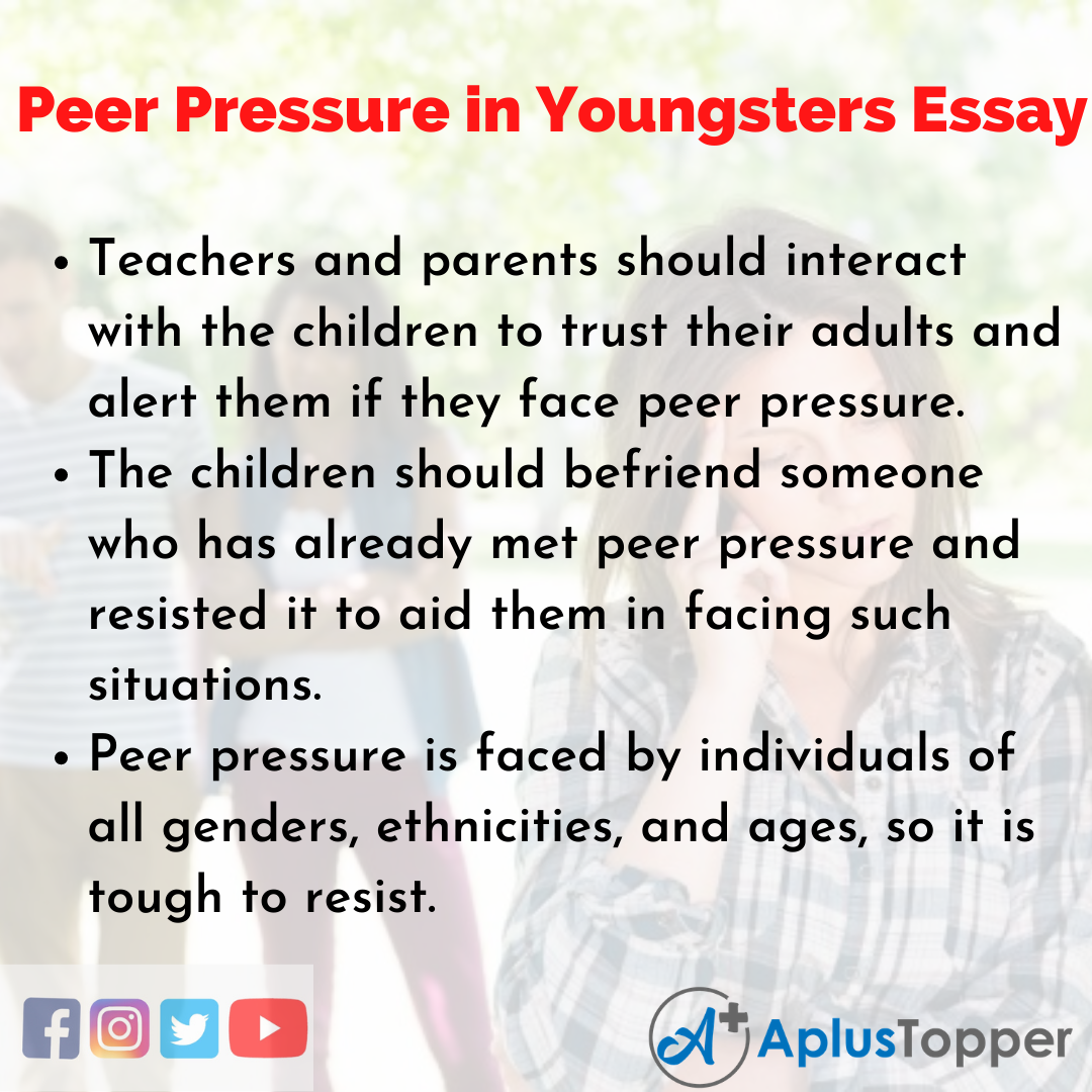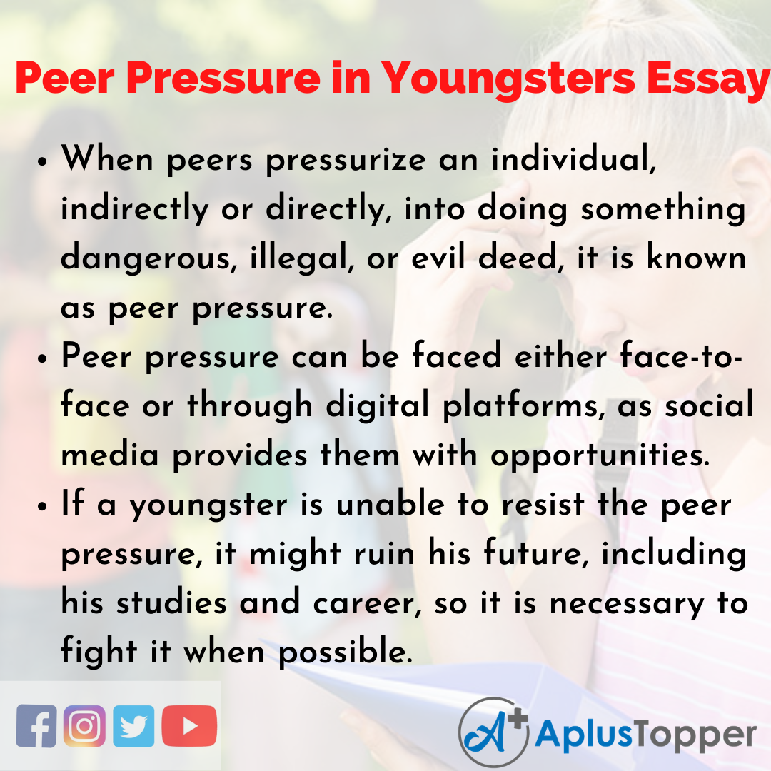 Peer Pressure in Youngsters Essay: Peer pressure is a direct or indirect influence on an individual, which forces them to change their behaviours and attitude so that the influencing groups are satisfied.