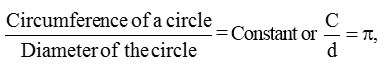 Thus, we haveThe constant ratio of circumference to diameter, i.e., 3.142 is denoted by Greek letter π, read as pi (π). - For calculation purposes, the value of \(\frac { 22 }{ 7 }\) is taken as or 3.14 approx.