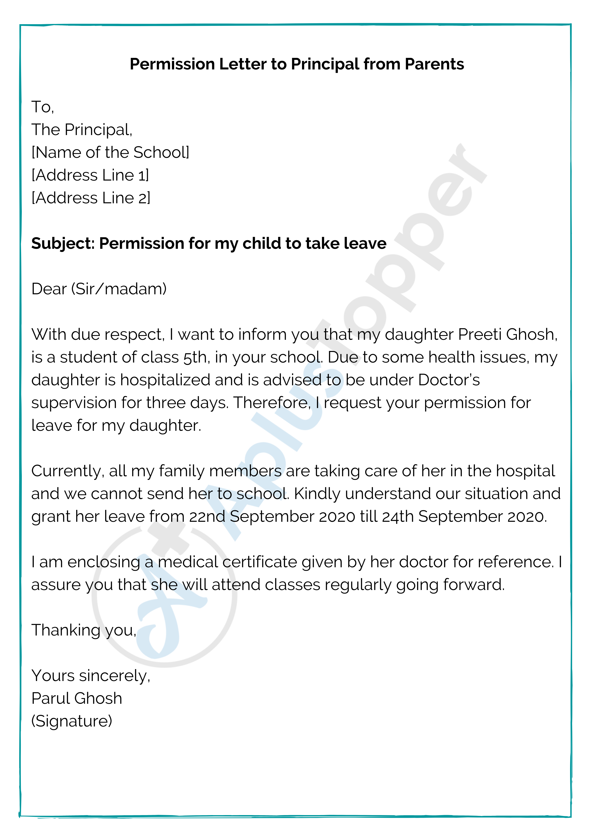 Sometimes the parents of students in the school write a letter addressing their principal to get permission on behalf of their children. Let us check a sample letter for the same.