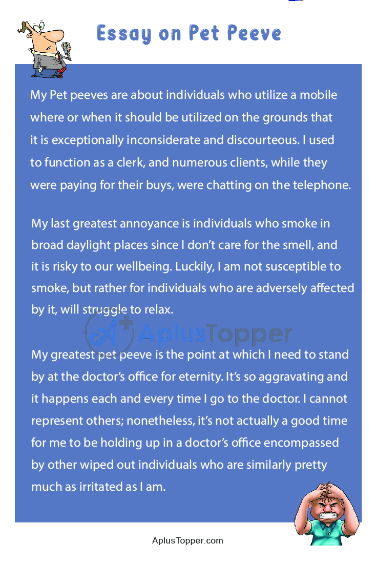 People have different types of pet peeves. Based on their category of annoyance, they can write the essay. Some of the topics or title they can use for the essays are:
